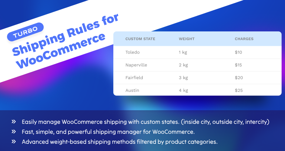 TURBO – Shipping Rules for WooCommerce** allows you to define and manage custom state (or district) options and create flexible shipping methods (weight-based with product category filters) for any country in WooCommerce checkout forms.